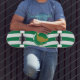 Skateboard with design with a flag of historic county of Wiltshire, in England, Great Britain; white and green flag with angled stripes and great bustard in the center