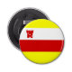 Button Flaschenöffner mit Fahne der Stadt Santa Barbara, Kalifornien; Flagge mit senkrechten Trifarben weiß, rot und gelb, mit Abbildung eines roten Forts in der oberen links Ecke