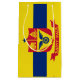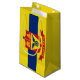 Papiertasche mit der Flagge der Stadt St. Paul, Minnesota; Flagge mit drei horizontalen Streifen von blau und gelb mit rotem Emblem in der Mitte