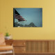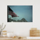 Ein Foto der amerikanischen Flagge, die in der Brise über Berge schwingt.