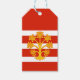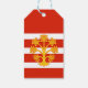 Preis-Tag mit Design mit einer Fahne des historischen Landkreises von Westmorland, in England, Großbritannien; weiße und rot gestreifte Fahne mit goldenem heraldischem Apfelbaum in der Mitte