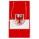 Papiertüte mit Brandenburger Flagge, Design mit zwei rot-weißen Streifen mit dem Wappen des Staat, in der Mitte ein roter Adler dargestellt