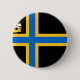 Round Button mit Design mit einer Flagge des historischen Landkreises von Kaithness in Schottland, Großbritannien; Schwarze Flagge mit blauem und gelbem nordischem Kreuz und eine Abbildung eines Schiffes mit einem Rabe auf seinem Segel im oberen Hoist