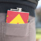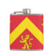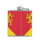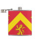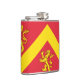 Vinyl umhüllte Flasche mit Design mit einer Fahne des historischen Landkreises von Anglesey, in Wales, Großbritannien; rote Fahne mit gelben Zickzack und drei Löwen; die zugeschriebenen Arme von Hwfa ap Cynddelw, das traditionelle Abzeichen des Landkreises