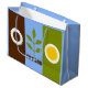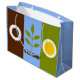 Große Geschenktasche mit Fresno, Kalifornien; Fahne mit drei senkrechten Bändern in Braun, Blau und Grün, mit stilisierten Abbildungen von Grau, Pflanze und Sonne
