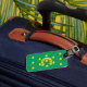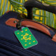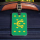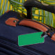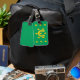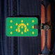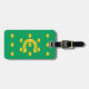 Gepäckmarke mit Design mit einer Fahne des historischen Landkreises von Rutland in England, Großbritannien; grüne Fahne mit Eicheln und goldenem Hufeisen in der Mitte
