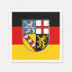 Papierserviette mit Saarlandflagge; Design mit horizontaler Trikolore aus Schwarz, Rot und Gelb (golden), mit Wappen des Staat in der Mitte
