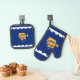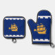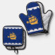 Pot Holder Set mit der Fahne von Quebec City, der Hauptstadt Stadt Quebec, Kanada. Blaue Flagge mit weißer Kontur und gelbem Schiff in der Mitte