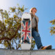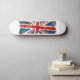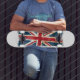 Dieses Element hat die britische Flagge in einem bedrückten Stil, der in einem leichten Winkel. Die Fahne wird in einem horizontalen Bar mit aufgelösten Kanten zugeschnitten. Das Vereinigte Königreich Großbritannien und Nordirland verwendet als Nationalflagge das königliche Banner, das als Gewerkschaft-Flaggen oder als Unionsflagge bezeichnet wird — Technisch ist der letztere Begriff, obwohl der häufigere Name für die Flagge, bezieht sich auf seine Verwendung als Jack der Seeschifffahrt auf See.[1] Die derzeitige Konstruktion der Flagge stammt aus der Gewerkschaft Irlands und Großbritanniens im Jahr 1801. Es besteht aus dem roten Kreuz des Heiligen Georgs (Schutzheilige von England), in weiß gekleidet, überlagert auf das Kreuz des St. Patrick (Schutzheilige von Irland), die überlagert werden auf den Salreifen von Heiligen Andrew (Schutzheilige von Schottland). Wales ist jedoch in der Gewerkschaft Flag nicht durch den Schutzheiligen von Wales, Saint David, vertreten, da zum Zeitpunkt der Konstruktion der Fahne Wales war Teil des Königreichs England.