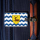 Gepäckmarke mit Design mit einer Flagge des historischen Landkreises Hertfordshire in England, Großbritannien; Flagge mit einer Darstellung eines Stages in einem gelben Schild auf weißem und blauem Hintergrund