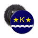 Button Flaschenöffner mit Design mit der Fahne von Kinshasa, Hauptstadt Stadt der Demokratischen Republik Kongo, blaue Flagge mit Weißwelle, zwei goldene Sterne und Buchstabe "K" in der Mitte