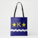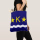 Tasche mit Design mit der Fahne von Kinshasa, Hauptstadt Stadt der Demokratischen Republik Kongo, blaue Flagge mit Weißwelle, zwei goldene Sterne und Buchstabe "K" in der Mitte