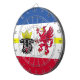 Dartboard mit variantenreicher Fahne aus Mecklenburg-Western Pommern; Design mit fünf horizontalen Streifen rot, weiß, blau und gelb, mit Abbildungen von Bullenkopf und Rotadler