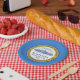 Papierteller mit der Flagge von Boston, Massachusetts; hellblaue Flagge mit Siegel der Stadt