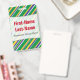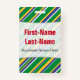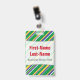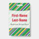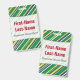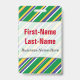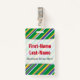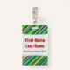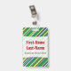 Dieses Abzeichen-Design weist ein Muster von Streifen (oder Linien) aus verschiedenen Breiten, grün, gelb, blau oder weiß gefärbt. Diese Farben wurden von denen der Nationalflagge von Brasilien inspiriert. Es enthält auch einen personalisierten Namen in rotem Text innerhalb eines hellen Bereichs. Es gibt auch eine benutzerdefinierte Nachricht unter dem Namen, die Informationen anzeigen könnte, wie z. B. einen Job-Rollennamen, einen Beruf oder einen Unternehmens-/Firmennamen. [~Z0000176]