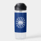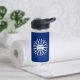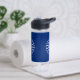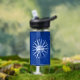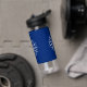 Wasserflasche mit der Flagge der Stadt Buffalo, New York; blaue Flagge mit weißem Siegel der Stadt und 13 Blitzschrauben