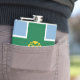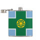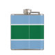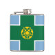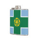 Vinyl umhüllte Flasche mit Design mit einer Fahne des historischen Landkreises von Derbyshire, in England, Großbritannien; blaue Fahne mit einem grünen Kreuz und eine goldene Tudor-Rose in der Mitte