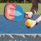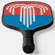 Pickleball Paddle mit einem Design mit der Flagge von Kansas City, Missouri. Eine rote und blasse Flagge mit einem stilisierten weißen Emblem in der Mitte