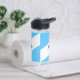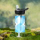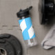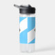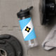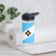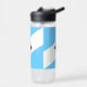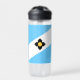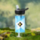Wasserflasche mit der Flagge der Stadt Madison, Wisconsin; hellblaue und weiße Flagge mit schwarzem Kreuz und gelben Kreis in der Mitte
