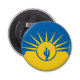 Button Flaschenöffner mit Fahne der Stadt Mesa, Arizona; gelbe und blaue Fahne mit stylisierten Illustrationen von Wüste, Kakteen und aufsteigender Sonne
