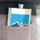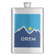 Flasche mit einem Design mit der Flagge von Orem, Utah. Eine blaue, weiße und gelbe Flagge mit Berggipfeln und der Sonne im Zentrum