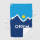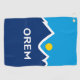 Golf Handtuch mit einem Design mit der Fahne von Orem, Utah. Eine blaue, weiße und gelbe Flagge mit Berggipfeln und der Sonne im Zentrum