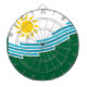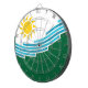 Dartboard mit einem Design mit der Flagge von Spokane, Washington. Eine weiße und grüne Flagge mit blauen Linien, die den Spokane-Fluss und den Spokane-Fall symbolisieren, und eine gelbe Sonne