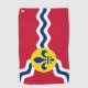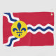 Golftücher mit Fahne der Stadt St. Louis; rote Flagge mit weißen und blauen Wellen und blaue Flöte in gelbem Kreis
