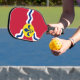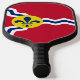 Pickleball Paddle mit der Fahne der Stadt St. Louis; rote Flagge mit weißen und blauen Wellen und blaue Flöte in gelbem Kreis