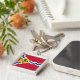 Keychain with flag of city of St. Louis; red flag with white and blue waves and blue fleur-de-lys in yellow circle