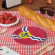 Papiertafel mit der Fahne der Stadt St. Louis; rote Flagge mit weißen und blauen Wellen und blaue Flöte in gelbem Kreis