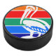 Hockey Puck mit einem Design mit der Fahne von St. Petersburg, Florida. Eine Fahne mit orangefarbenen, roten, grünen, blauen und marineblauen Streifen mit einem Symbol für das weiße Pelikan