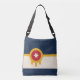 Crossbody Bag mit einem Design mit der Flagge von Tulsa, Oklahoma. Eine beige und marineblaue blaue Flagge mit goldenem Osage-Schild, die einen roten Kreis und einen beigen, sechsspitzen Stern enthält
