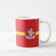 Tasse mit Design mit Fahne von Vilnius, Hauptstadt Stadt Litauen; rote Fahne mit gelbem Streifen und Wappen mit zwei goldenen Löwen mit einem Schild in der Mitte