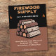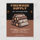 A promotional flyer featuring a stack of split firewood logs, orange flames icons and wood grain-textured text.