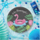 Das Watercolor Flamingo Design zeichnet sich durch einen grünen Blattrand mit rosa Elementen und einen farbenfrohen Flamingo aus. Nutzen Sie für jeden Anlass!