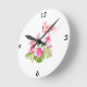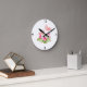 Diese rund geformte Wanduhr wird mit einem niedlich rosa Flamingo-Kunstdruck gezeigt. Passen Sie dieses Objekt an oder kaufen Sie, wie es ist. Bild