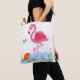 Flamingo, der einen Fisch in einem Teich serviert. Der Goldfisch, der hinaufschaut und der Flamingo stehend in der Nähe, suggeriert einen Moment der gegenseitigen Neugier und Beobachtung zwischen zwei verschiedenen Arten.