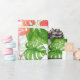 Aquarellmuster Design mit Flamingo-Blume und Vögeln, Monstera und Palmen-Blätter.