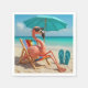 Ein Flamingo in Sonnenbrillen entspannt sich auf einem bunten Liegestuhl unter einem türkisblauen Sonnenschirm am Meer, mit aufrechten Flip-Flops im Sand