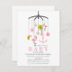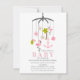 Eine moderne Babydusche-Einladung mit einer Illustration eines nautischen inspirierten Crib-Handys mit Illustrationen von Flamingos, einer Palme, Palmen-Blätter, einem Anker, Sand-Dollar und Blume.