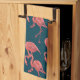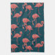Vector Muster mit handgezeichneten Flamingos in lebendiger Korallenfarbe auf dunkelblauem Hintergrund.