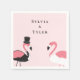 Flamingo-gezapfte Servietten mit Flamingo-Braut und Flamingo-Bräutigam auf einem rosa Hintergrund. Fügen Sie einfach Ihre Namen hinzu, fügen Sie diese Servietten in Ihren Warenkorb und genießen Sie Ihre flamingo-gefüllte Hochzeit. Flamingo Name Wedding Napkins Holidayday Design | ©Melissa Patton - Designer/Illustrator