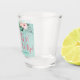 Schießglas mit tropischen Blumen und Flamingo-Design für einen Let's Flamingle Junggeselinnen-Abschied. Das Design ist mit türkisfarbenem, omber Hintergrund, Aquarellbramingo und Blumenstrauß gestaltet.