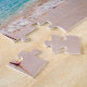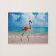 Dieses Spielpuzzlespiel wird mit einem Fotodruck des Flamingovogels auf dem Strand gezeigt.