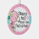 Dieses hübsch niedliche und lustige Flamingo-Ornament wird eine schöne Ergänzung zu jedem Baum für den Urlaub sein. Freuen Sie sich auf einen pinkfarbenen Hintergrund und einen Flamingo-Cartoon. Liest 'Stand hoch und sei fabelhaft'. Auf Caperuza Sketch.