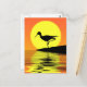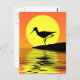 Eine helle und fröhliche Postkarte, um jemanden mit einer Silhouette Flamingo auf einer Insel vor einem gelben und orangefarbenen Sonnenuntergang zu schicken.