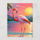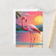 Rosa Flamingo Bird an einem tropischen Strand mit Meer und einem Sonnenuntergang im Hintergrund