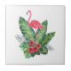 Illustrationsgrafik eines rosa Flamingos mit grünen tropischen Blätter auf weißem Hintergrund