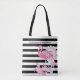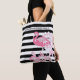 Die Produktgestaltung umfasst einen Flamingo mit kaleidoskopischen Paisley-Mustern in Rosa über schwarz-weißem Streifen Hintergrund. Dieses tropische Vogeldesign mit personalisiertem Text macht eine moderne und einzigartige Totentasche.